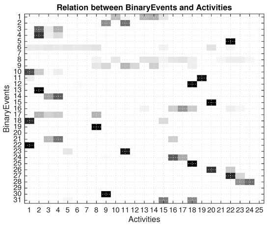 Measurement matrix relating binary events with activities, obtained from the seven days training set.