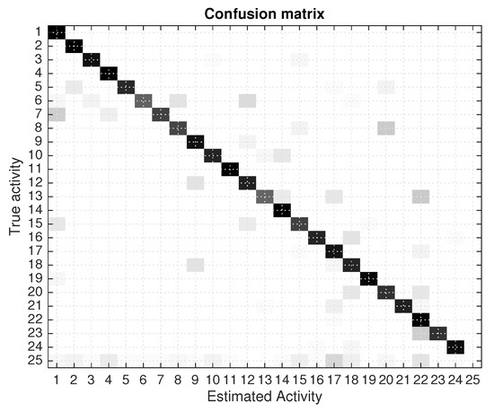 The overall detection results for the 7 days tests are shown in Figure 3 where a confusion matrix is presented. There is a predominant diagonal dark line, which represent the correct detections of activities, but also some off-diagonal estimations that represent estimation errors.