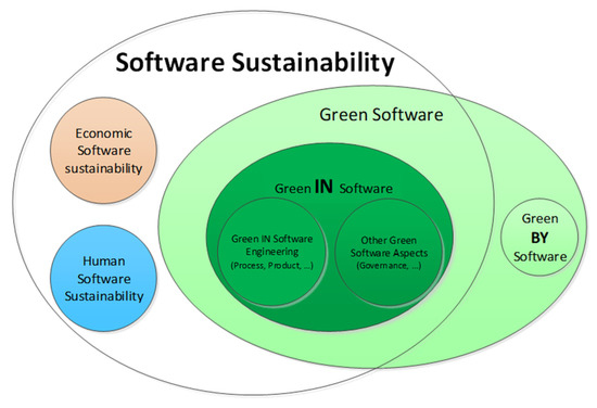 - Green by software. Software that is developed for domains that work to preserve environmental sustainability, i.e., software which serves as a tool to support sustainability objectives.