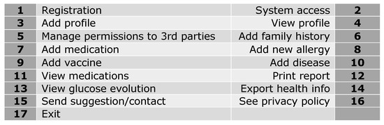 From the basic tasks of a PHR published on myPHR.com, a list of 17 common tasks for a patient was proposed, in the quest to analyze the energy consumption and usability of the chosen web portal (Figure 4).