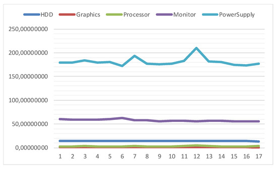From the obtained results of both correlation coefficients (Figure 7), we observe 4 significative correlations (in grey): (1) HDD and graphics, (2) HDD and monitor, (3) monitor and graphics; and (4) power supply and processor.