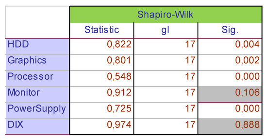 As shown in Figure 6, the monitor data (W = 0.106) have been extracted from a normally-distributed population, while the HDD (W = 0.004), graphics (W = 0.002), processor (W = 0.0) and powersupply (W = 0.0) have not. The correlation of the monitor data was therefore made with the Pearson correlation coefficient, while the correlation for HDD, Graphics, processor and power supply was made with the Spearman coefficient.