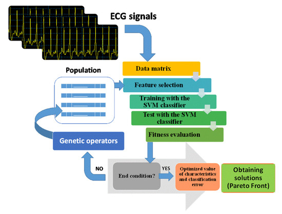 In the work carried out in the present contribution, two different approaches have been used for the selection of characteristics: filter type approach (PCA, mRMR, MILCA) and Wrapper type approach, where the final classifier is also relevant, (in this sense they have carried out methodologies that hybridize Genetic Algorithms for selection of variables and intelligent classifiers type SVM, see Figure 2).