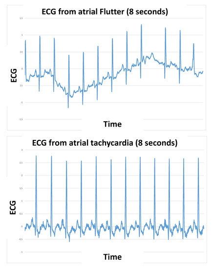 Examples of ECG signals (a single derivation is included for brevity) for a time window of 8 s in the pathology of atrial flutter and atrial tachycardia.
