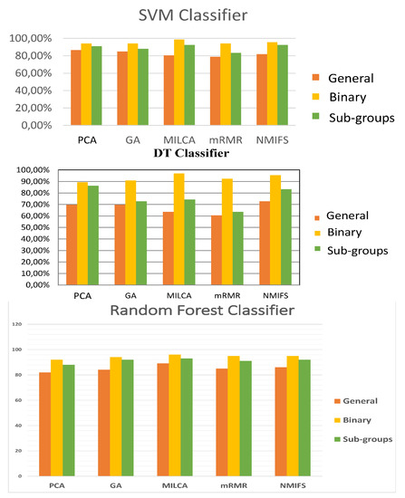 In summary, for the study of the ECG, Figure 3 shows the results obtained by the different methods of feature selection. As can be seen, the Multi-objective Genetic Algorithm is the methodology that contains a larger set (84 characteristics), while the MILCA method selects 31 and with the PCA technique we obtain 29 main components (however, these components do not correspond to the initial characteristics, being linear combination of the initial 142 characteristics and therefore, were not used in the present project in the process of classification of pathologies). The output of the NMIFS (normalized mutual information feature selection) and mRMR methods provide us with a set of characteristics of the same size as the initial set, but ordered by relevance or importance. The best 15 were selected, since with this threshold an adequate precision was obtained.