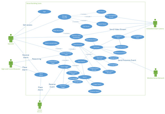The use case diagram depicted in Figure 1 shows the interaction among the different actors involved in the system: the ESC and the WSN are the peripheral smart subsystems that send events of interest (face, motion or presence detection); every time an event occurs, the Activity Monitor (AM) decides if it is the case to trigger an alarm depending on the security parameters active in that moment. The Operator (typically a person of the security staff) receives the alarm via monitor, email or text; he can browse all the historical data (events, video, etc.), manage the faces’ database and do searches according to the information provided by the High Level Reasoner (HLR), which is an A.I. agent that performs the analysis and understanding functionality described before.