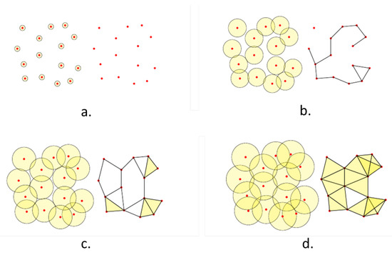 An example of the Rips-Vietoris complex associated to a 2D point could, with the filtration parameter d induced by the Euclidean distance between points. At the complex is made of the 0-points, as shown in (a); increasing d in (b), (c) and (d), edges, faces and tetrahedra enter the simplical complex.