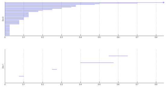 An example of two barcodes (dim 0 and 1) from the experiment described in Section 3: they are computed from , with .
