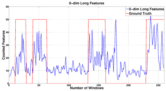 Figure 4 shows the number of counted features for each , with . The comparison of this graph with the ground truth suggests that the greater number of features is obtained for those windows corresponding to the presence of the user in the office. In general, features in dim 0 showed better correlation with room occupancy than features in dimension 1. This is probably due to the fact that 0-dimensional features are linked to the correlation between samples within the windows considered, while features in dim 1 are indicators of possible periodic pattern in the signal time series, which are negligible in our data.