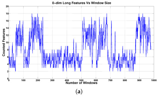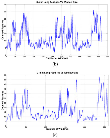 0-dim Long Features vs. Window Size: each graph shows the number of features counted in the corresponding sliding window of size 18 in (a), 34 in (b), and 68 in (c). Note that increasing the window size results in a larger number of features. (a) W = 18; (b) W = 34; (c) W = 68.