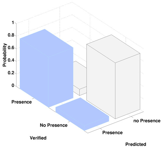 Figure 6 shows the prediction performance obtained with the descriptor extracted from sensor time series with the values and , which provided the best set of descriptors for the detection procedure. The values ‘Presence’ and ‘no Presence’ in the axes ‘Verified’ are the ground truth, as registered by the room occupant; values ‘Presence’ and ‘no Presence’ in the axes ‘Predicted’ are those obtained by our detection algorithm. Figure 6 shows that the detection algorithm detects a ‘Presence’, which is confirmed by the ground truth. Instead, with a probability of 88% the detection algorithm detects a ‘no Presence’, which is again confirmed by the ground truth. The algorithm performance in our preliminary study is promising compared to the results in [3], considering that their period of experimentation is quite longer (one month vs one week).