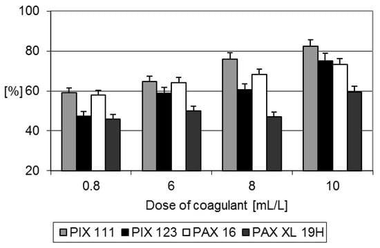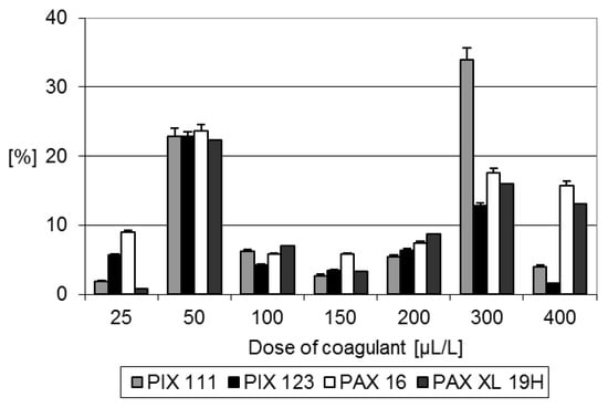 Efficiency of COD removal by coagulation with PIX 111, PIX 123, PAX 16, PAX 19H in the dose ranged from 25–400 μL/L.
