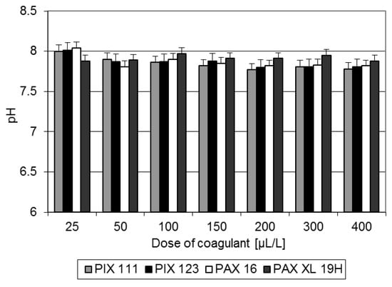 pH during coagulation in the doses of coagulants from 25 to 400 μL/L.