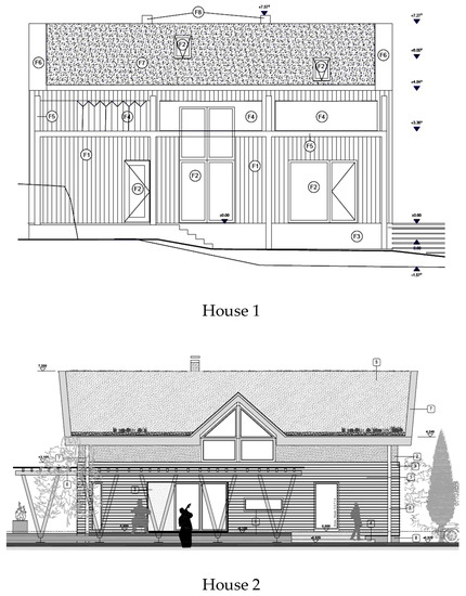 The second house with a built-up area of 68 m2 is located on a flat terrain in the village of Jedlinka. It is also designed as a separate two-storey building for four-person household. In terms of the existing area, it is oriented to the south-east and south-west. The family house has a similar layout solution as the first one. On the ground floor there is living room with kitchen, children’s room, bedroom, bathroom, staircase, technical room, storage room and lobby. The second floor consists of room, workroom and bathroom. The vertical load-bearing structures of the perimeter walls are designed from straw panels covered fiberboards. The building is equipped with its own heat source—An electric boiler with a water tank (14.0 kW). The architecture of both buildings is given by the design itself, consisting of a vegetation roof and a façade wood finish (Figure 1).