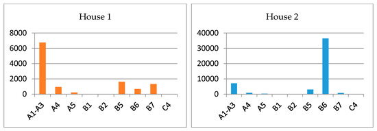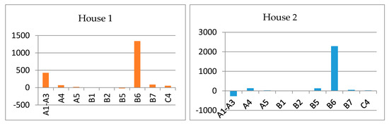 Family house 1 significantly contributes to ADPF in product phase (A1–A3) with value of 59%, phase of recurring (B5) with percentage weight of 14% and in phase of water use with value of 11%. With regard to the family house 2, the phase of energy use significantly contributes to ADPF with percentage weight of 75% due to electrical energy used for operation of the house. Product phase contributes to ADPF only by 14% due to using natural building materials.