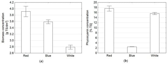 Figure 1b shows the effect of light of different wavelengths on phycocyanin content and phycocyanin productivity of Arthrospira platensis. The highest phycocyanin content was noted for biomass cultured using Red LED lighting and it amounted to 17.61 ± 0.51%. The culture with Blue LED lighting was characterised by the lowest phycocyanin content in the cells, which was 2.47 ± 0.03. Lima et al. [], when researching the effect of the spectral quality of light on the accumulation of pigments in Arthrospira platensis biomass, also observed that the highest phycocyanin concentration (16.71%) was obtained with the use of a red LED (660 nm). On the other hand, when a blue light (450 nm) was used, no presence of phycocyanin was demonstrated in Arthrospira platensis biomass. Chen et al. [], when researching the effect of red, white, blue, yellow and green LEDs, also observed the highest phycocyanin content of 15.2% TS in the culture using red light.