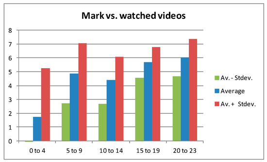 In order to assess quantitatively the influence of videos, information provided by Moodle about number and time of video visualization has been used and correlated to students’ marks. Figure 1 shows how these marks depend on the number of videos watched (what ranges from 0 to 23). In each group, the average mark, and this average plus and minus its standard deviation is represented. Figure 2 shows the distribution of number of videos visualization. It can be seen how the number of students watching less than 5 videos is very low and more than one third of students watch at least 15 videos.
