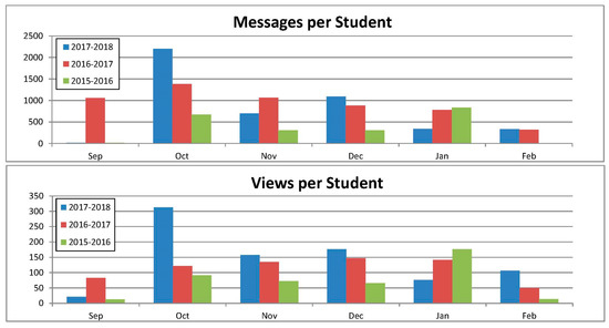 Global activity in Moodle can be found in the menu Administration/Reports/Statistics. Views include passive user activities, while Messages refer to active user responses [8]. The graphs of Figure 2 show the results of the last three courses from September to February.