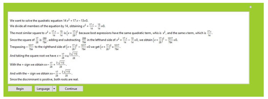 A crucial point in the use of applets to implement the methodology of Learning by Example is the generation of random data that can feed the parameters of the problems. For instance, in the applet presented in the Results section, examples of resolution of quadratic equations by completing the square are given. The three coefficients of the equation are taken as random integer numbers between −20 and 20, with the restriction that the coefficient of the quadratic term must be non-zero. In this way the students can be provided with an ample repertoire of many non-repeating examples, so that they have those materials permanently available. Besides, they can work the examples any number of times until they fully understand the topic presented in the applet.