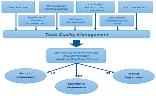 Total Quality Management (TQM) is a management philosophy that aims at continuous improvement of organizational performance and customer satisfaction, being transversal to the whole organization and incorporating in its model all the actors of the organizational structure. Many of the researches that have focused on the effects of TQM over the competitive advantage have shown that its presence leads to improved performance and increased competitiveness [1,2]. TQM principles have been applied in the industrial sector for several decades, however, its application in service companies and, more specifically, in HEIs has recently emerged as a new concept, framed in new realities that began to recognize higher education institutions as profitable organizations.
