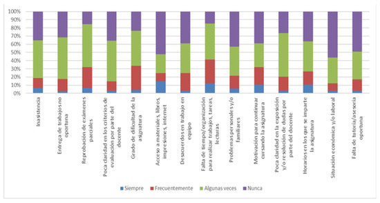 It is worth mentioning, from the perceptions of the students of Campus 1, the factors that were never present for the academic failing and that are not significant in the occurrence of the same are the following: Economic and/or labor situation of the student (56% never), personal and/or family problems (43% never), lack of timely tutoring/counseling (49% never), access to materials, books, impressions, internet (52% never). See Figure 1.