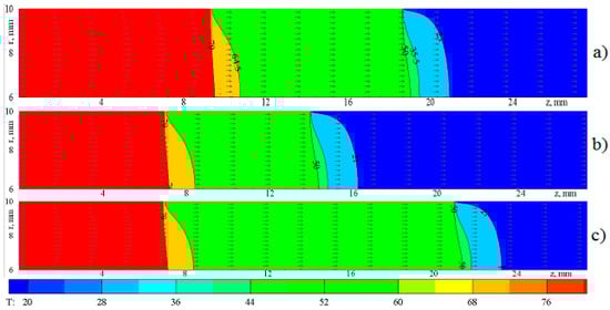 Distributions of the temperature over the annular cavity length at different ratio of the length of the cooling circuits at , (a) L1 = L3 = 9.4 mm, L2 = 9.2 mm; (b) L1 = L2 = 7 mm, L3 = 14 mm; (c) L1 = L3 = 7 mm, L2 = 14 mm.