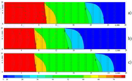 The profile of the longitudinal component of the velocity attains the shape of shear flow of the fluid near the inlet section due to high viscosity of the thermoplastic slurry (Figure 1). Wall temperature in the first cooling contour is and temperature field changes from to in this zone (Figure 1). Temperature isolines (isotherms) show the regions of the constant temperature and internal structure of the slurry mass which is in liquid state. Wall temperature is in the second cooling contour. Sharp reduction of the wall temperature generates intensity growth of the slurry cooling, it also leads to the change of the rheological and thermo-physical properties of the slurry. Heat pick-up growth results in reduction of the temperature field in the second cooling contour (Figure 1). There is a transition zone in the beginning of the second contour, where temperature field is variable and expresses the transition of the slurry from the liquid state into the viscous-plastic state. The slurry temperature changes from to and defines upper boundary of the zone with constant temperature . Wall temperature in the third cooling contour is ., which leads to the further cooling of the slurry mass and temperature reduction from to in the transition zone. According to the experimental data, change in aggregate state takes place at temperature . In energy equation heat release during aggregate state change occurs due to solidification of the viscous-plastic slurry.