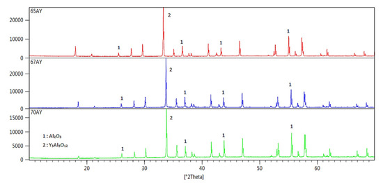 In the Figure 1, it is shown phases analysis of sintered 3 samples. The sintered rigid samples obtained from the Al2O3-Y2O3 powder mixture containing 65% Al2O3, 67% Al2O3 and 70% Al2O3 by weight, were named as 65AY, 67AY and 70AY.