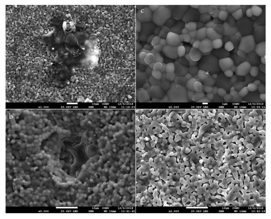 SEM photographs of microstructures of sintered composites: (a) 65AY, (b) 70AY, (c) 67AY, (d) 67AY.