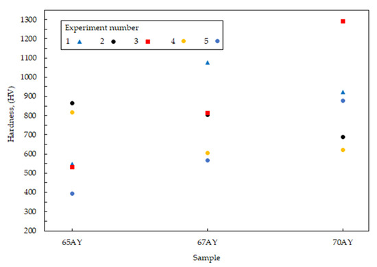 Vickers hardness values of 65AY, 67AY and 70AY eutectic ceramic composite materials.