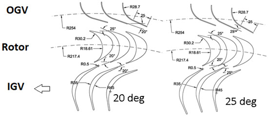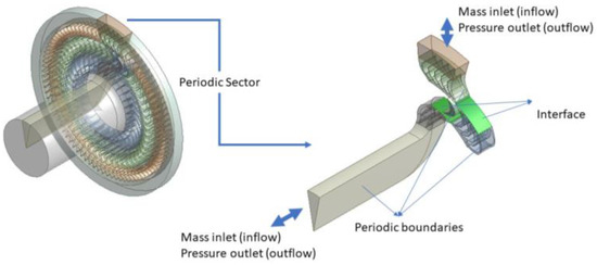 Details of turbine geometry in Figure 4 could be found in Ref. [8]. Using a validated model Ref. [8], the setting angle for IGV and OGV was changed to 25°. Additional geometrical arrangements are shown in Table 1.