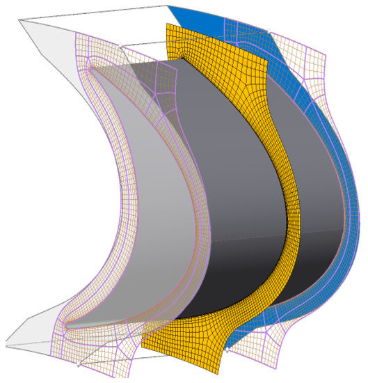 To be able to build a proper numerical model for the turbine geometry and correctly solve the flow variables, Ansys V16.2 has been used. The model was built with one row for the IGV, a rotor row and one OGV row. This last OGV stands as an elbow, as can be observed in Figure 2.