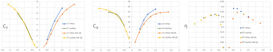Results were conducted after changing the setting angle for the IGV and the OGV of the turbine Figure 4. On the other hand, Figure 5 analyzes the turbine performance in 3 means first the CT and it has been found increase in the rotor torque as a result of changing the angle of IGV guiding more flow towards the rotor blades in the inflow process despite no change was noticed in the outflow process assuring that the orientation of the OGV don’t affect the rotor torque. Same phenomena could be found the input coefficient for the turbine showing increase only in the inflow process not the outflow. The efficiency curve concludes what had been notified in the CT and the CA showing an obvious increase in the efficiency during the inflow but same during the outflow.