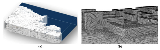 (a) Geometry representing an area of Gijón (dimensions of the domain: 14.5 km × 10 km × 1 km); (b) Details of the mesh taking into account the buildings.