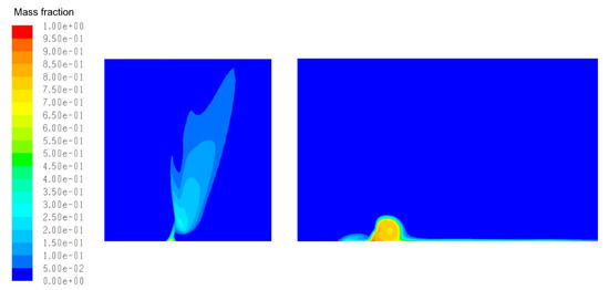 Mass fraction of the pollutants when the contaminant gas is lighter than the air (left figure); pollutants when the contaminant gas is heavier than the air (right figure).