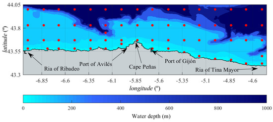 Bathymetry of Asturias and location of the SIMAR data points considered in this work. The water depths are in meters (m).