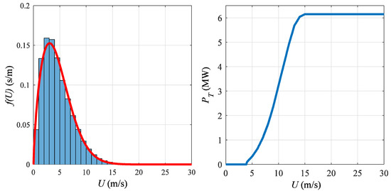 where PT(UT) is the power curve defined as a density function of the wind speed at the rotor height and f(UT) is the Weibull probability density function of the wind speed at the rotor height. The total output energy for a given period of time, Eout, can be simply obtained by multiplying Pout by the corresponding time duration.