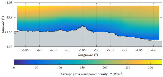 Average gross wind power density (P) off Asturias coast corresponding to a height of 10 m above the sea surface level.