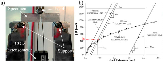Fracture toughness tests were carried out using SE(B) specimens (Figure 1a) with the following dimensions: 17.5 × 10 × 80 mm3 (W × B × L). In agreement of the ASTM E1820 standard, specimens were fatigue pre-cracked (R = 0.1) until a crack length-to-width relation a/W ≅ 0.5 and were subsequently side-grooved to obtain a final net-thickness, BN, of 7.3 ± 0.05 mm.