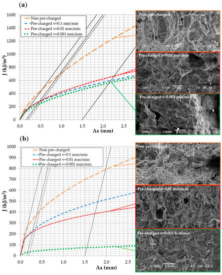 The single-specimen method, based on the elastic unloading compliance technique was used to determine the J-Δa (J-R) curves of both steels under standard laboratory conditions. Fracture toughness values, JIC, in accordance whit the ASTM E1820 standard, were calculated from these curves after a power regression line fitting procedure (Figure 1b). In addition to the standard test displacement rate (v = 0.1 mm/min), pre-charged specimens were also tested using lower displacement rates (0.01 and 0.001 mm/min). Once the different values of fracture toughness were obtained, the EI(%) embrittlement index was used to quantify hydrogen embrittlement: