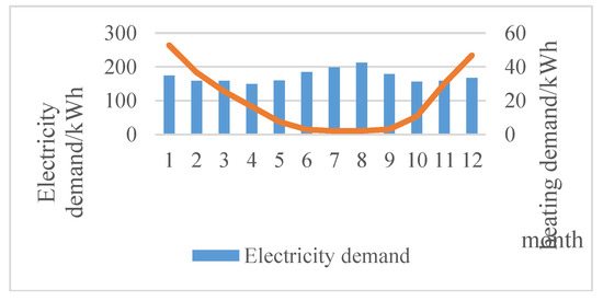 The daily average energy consumption of the building for each month is shown as Figure 3, where blue bars represent the electricity consumption and the red curve represents the heat demand. Electricity demand include air conditioning consumption and heat demand includes heating and hot water demand. As shown in Figure 3, in August, building has the most electricity consumption and the lowest heating demand. The highest electricity demand can approach 220 kWh per day and the highest heating demand is approximate 55 kWh per day.