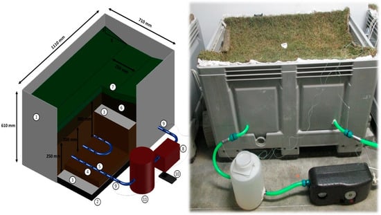 The research presented in this article introduces, for the first time, the application of greener SUDS like wet swales which could help in improving livability conditions and biodiversity at a higher level when introduced in urban areas []. The main aim of this study was to find out whether the design and construction of wet swales could be liable to be developed in combination with geothermal energy elements such as GSHP. With this aim, a laboratory experiment was carried out by simulating a GSHP device operating at different temperatures.