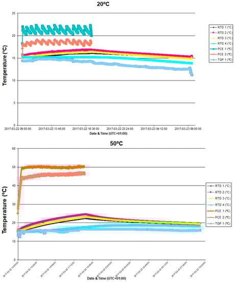 Four temperature sensors were located at 100, 200, 300 and 400 mm (RTD 1, 2, 3 and 4 in Figure 2), respectively, from the bottom line of the sub-base layer, measuring the temperature variation between the different layers when circulating water through the flexible pipes at several performing temperatures (20, 30, 40 and 50 °C), simulating a GSHP device. Furthermore, the temperature was measured in the inlet and outlet points of the model (9 in Figure 1) (PCE1, PCE2, respectively, in Figure 2). All temperatures were measured at 1 min intervals and each experiment lasted for 8 h. A 15 L insulated tank was used as a water reservoir (11 in Figure 1), being connected to a hydraulic pump (8 in Figure 1) in order to generate enough water flow inside the flexible pipe. Finally, the temperature within the simulated GSHP device was reached by using an electrical resistance controlled by a temperature device (10 in Figure 1).