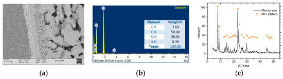 Figure 1a shows a membrane cross section SEM micrograph where the growth of the zeolite crystals can be observed on the inner support surface used in the synthesis; energy dispersive spectroscopy analysis is also presented (