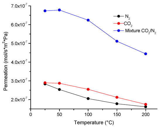 2 mixture, the permeation also decreases as a function of temperature; however, the permeation values are greater than that of the simple gases, namely, from 4.4404 × 10