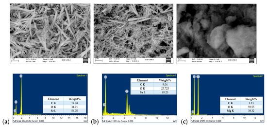 Figure 3 shows the morphology of the solids recovered in the carbonation reactions with the different alkaline solutions as well as the elemental analysis carried out that shows the presence of carbon in the solids.