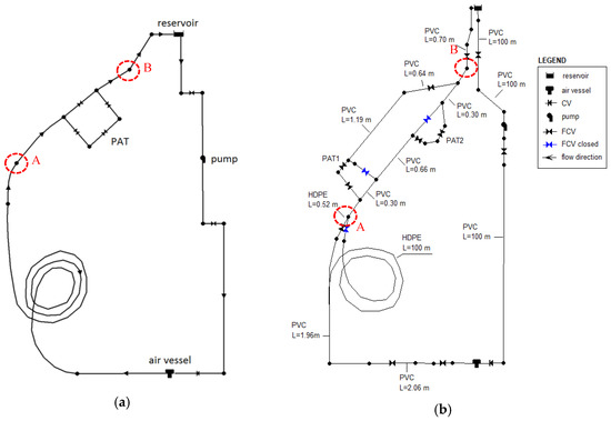 Scheme of the experimental hydraulic facility at CERIS-IST Lab: (a) single PAT; (b) two identical PATs in parallel.
