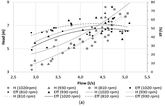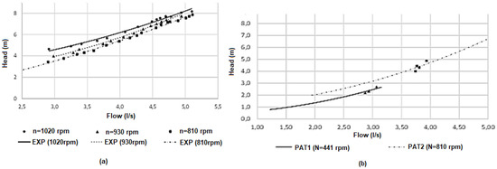 Comparing the results from single mode and in parallel operation, in the latter one it is possible to run the system to cover different flow rates than using only a single PAT (Table 1). When working a single PAT, the rotational speed and the efficiency are higher for a high flow rate. Figure 7 shows the characteristic curves achieved for both conditions, after validating the CFD model [6,10].