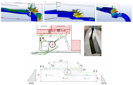 Possibility of installing in a typical exit open channel of a Waste Water Treatment Plant (WWTP), a hydrokinetic turbine at correspondence of Venturi Flume, or a hydrostatic wheel machine after the narrow section (Figure 4 top) are investigated. The theory behind a hydrostatic pressure wheel is based on the hydrostatic law (Figure 4 bottom), while the theoretical available power corresponds to: