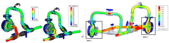 The boundary conditions assigned to sections A and B (Figure 2), are the inlet and outlet measured points of each PAT system, i.e., the volume of the flow rate, corresponding to each test, was allocated to the inlet condition, as for the outlet condition, the pressure recorded in the pressure transducer (located downstream of each set-up) was set. For the rotation of the impellers, the corresponding rotational speeds obtained experimentally were also considered (Figure 5). The centrifugal force effect rises with the increasing of the rotational speed. Figure 6 shows the pressure distribution of the PAT for 810 rpm (single mode) and 440 rpm and 810 (for PAT1 and PAT2 in parallel).